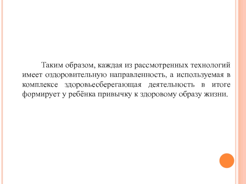 Таким образом, каждая из рассмотренных технологий имеет оздоровительную направленность, а используемая в комплексе здоровьесберегающая деятельность