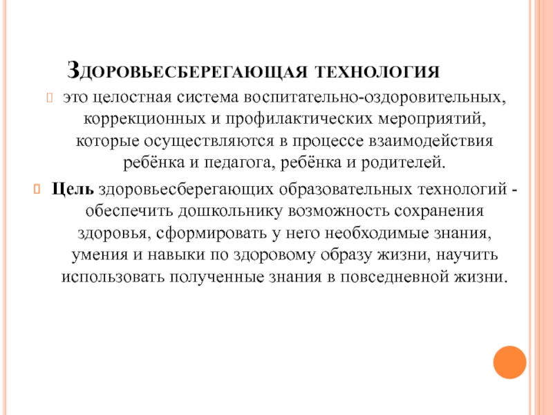 Здоровьесберегающая технологияэто целостная система воспитательно-оздоровительных, коррекционных и профилактических мероприятий, которые осуществляются в процессе взаимодействия ребёнка и педагога,