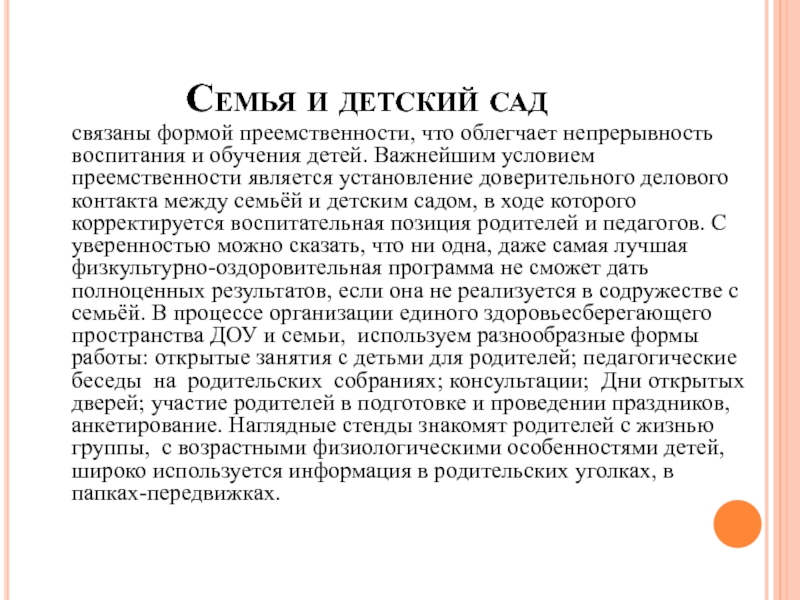 непрерывность воспитания и обучения детей. Важнейшим условием преемственности является установление доверительного делового контакта между семьёй и детским садом, в ходе которого корректируется воспитательная позиция родителей и педагогов. С уверенностью можно сказать, что ни одна, даже самая лучшая физкультурно-оздоровительная программа не сможет дать полноценных результатов, если она не реализуется в содружестве с семьёй. В процессе организации единого здоровьесберегающего пространства ДОУ и семьи,  используем разнообразные формы работы: открытые занятия с детьми для родителей; педагогические беседы  на  родительских  собраниях; консультации;  Дни открытых дверей; участие родителей в подготовке и проведении праздников, анкетирование. Наглядные стенды знакомят родителей с жизнью группы,  с возрастными физиологическими особенностями детей, широко используется информация в родительских уголках, в папках-передвижках.