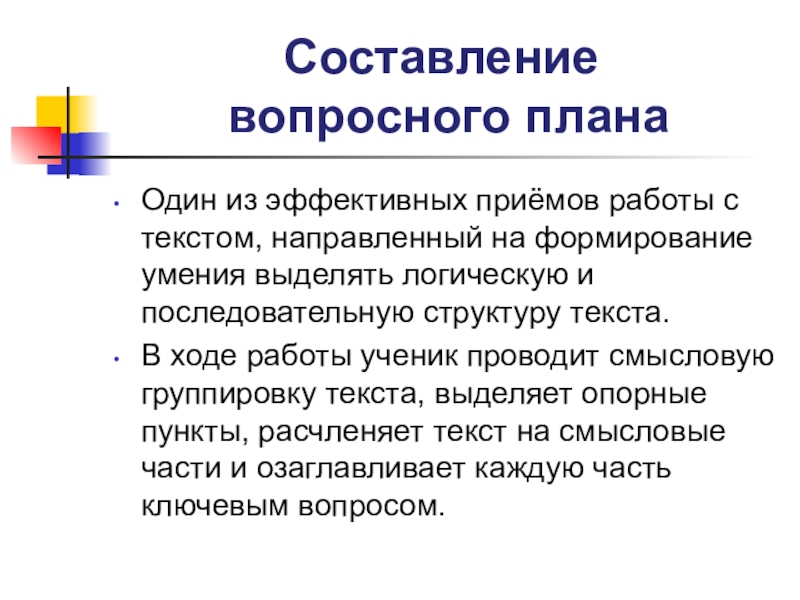 В ходе работы ученик проводит смысловую группировку текста, выделяет опорные пункты, расчленяет текст на смысловые части и озаглавливает каждую часть ключевым вопросом.