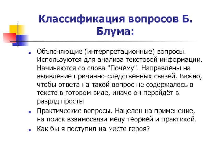 Объясняющие (интерпретационные) вопросы. Используются для анализа текстовой информации. Начинаются