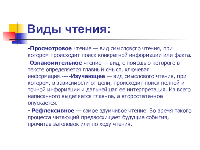 -Ознакомительное чтение — вид, с помощью которого в тексте определяется главный смысл, ключевая информация.----Изучающее — вид смыслового чтения, при котором, в зависимости от цели, происходит поиск полной и точной информации и дальнейшая ее интерпретация. Из всего написанного выделяется главное, а второстепенное опускается.