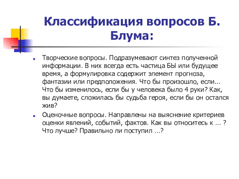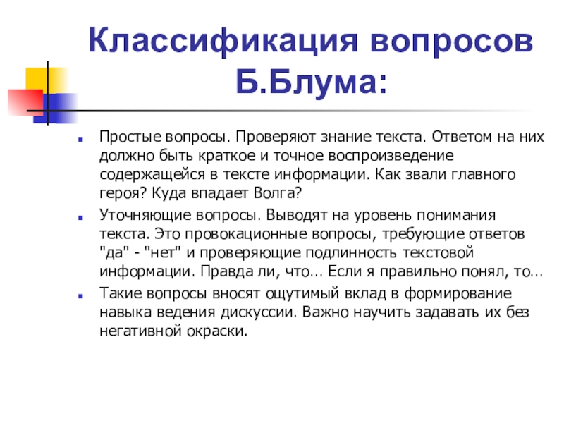 Наиболее удачная классификация вопросов была предложена американским психологом и педагогом Бенджамином Блумом.