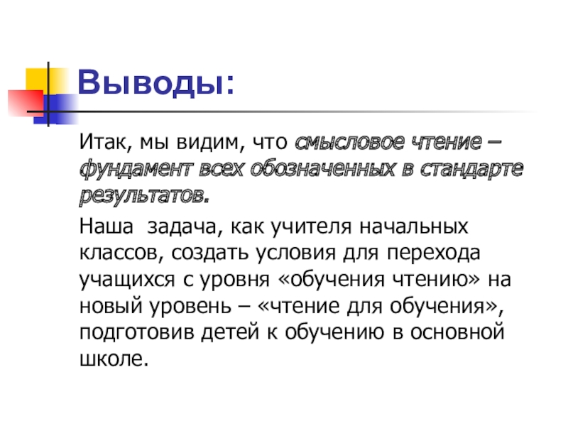 Наша задача, как учителя начальных классов, создать условия для перехода учащихся с уровня «обучения чтению» на новый уровень – «чтение для обучения», подготовив детей к обучению в основной школе.
