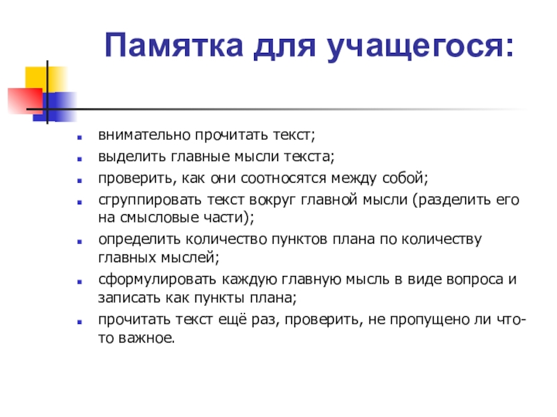 сформулировать каждую главную мысль в виде вопроса и записать как пункты плана;