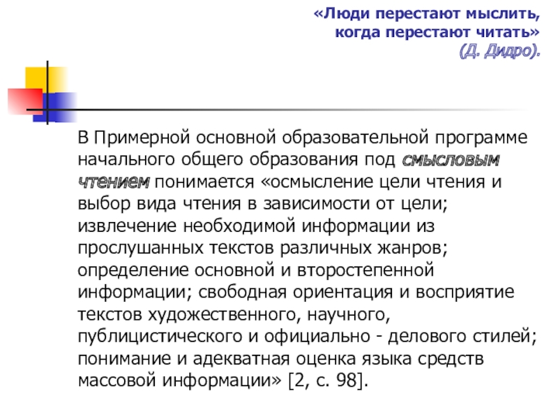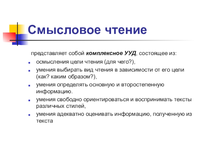 общего образования под смысловым чтением понимается «осмысление цели чтения и выбор вида чтения в зависимости от цели; извлечение необходимой информации из прослушанных текстов различных жанров; определение основной и второстепенной информации; свободная ориентация и восприятие текстов художественного, научного, публицистического и официально - делового стилей; понимание и адекватная оценка языка средств массовой информации» [2, с. 98].