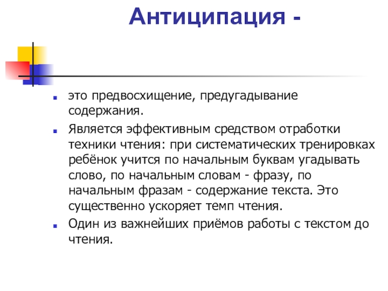 систематических тренировках ребёнок учится по начальным буквам угадывать слово, по начальным словам - фразу, по начальным фразам - содержание текста. Это существенно ускоряет темп чтения.