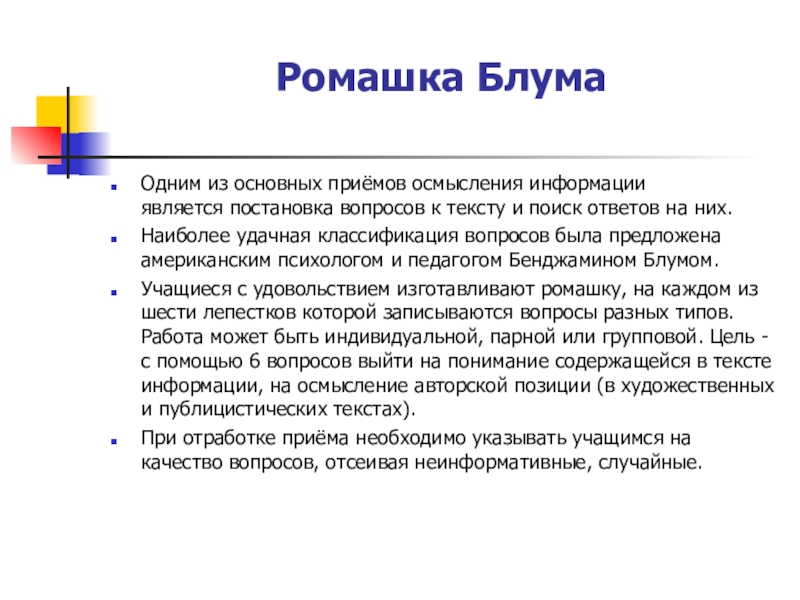 Учащиеся с удовольствием изготавливают ромашку, на каждом из шести лепестков которой записываются вопросы разных типов. Работа может быть индивидуальной, парной или групповой. Цель - с помощью 6 вопросов выйти на понимание содержащейся в тексте информации, на осмысление авторской позиции (в художественных и публицистических текстах).