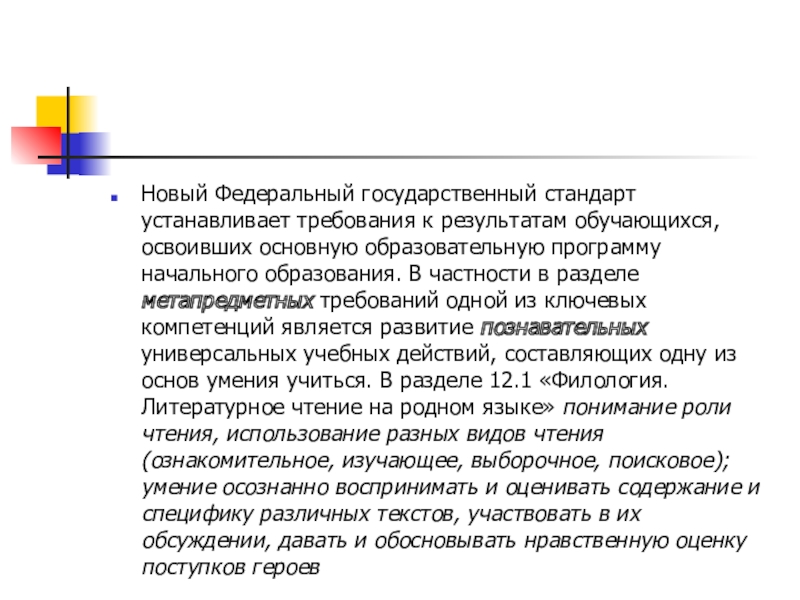 образовательную программу начального образования. В частности в разделе метапредметных требований одной из ключевых компетенций является развитие познавательных универсальных учебных действий, составляющих одну из основ умения учиться. В разделе 12.1 «Филология. Литературное чтение на родном языке» понимание роли чтения, использование разных видов чтения (ознакомительное, изучающее, выборочное, поисковое); умение осознанно воспринимать и оценивать содержание и специфику различных текстов, участвовать в их обсуждении, давать и обосновывать нравственную оценку поступков героев