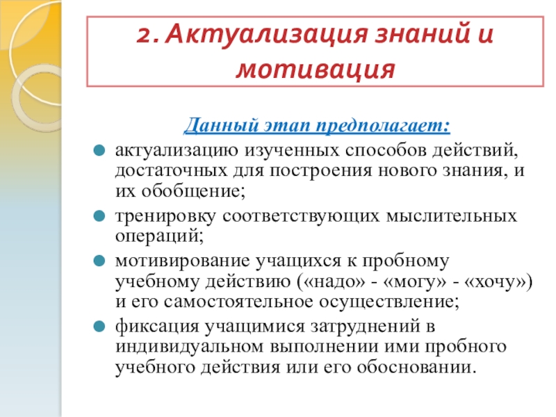 актуализируются требования к ученику со стороны учебной деятельности и устанавливаются тематические рамки («надо», «могу»).