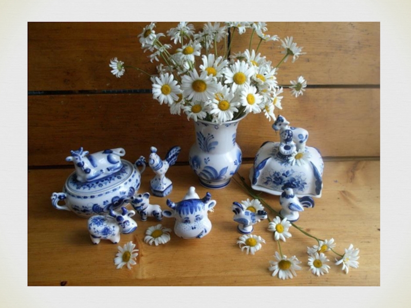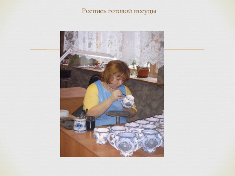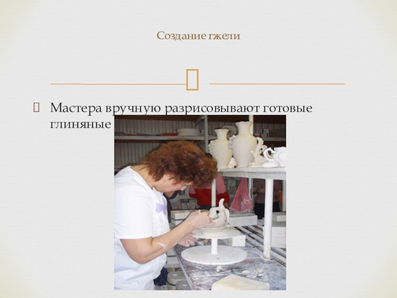 Мастера вручную разрисовывают готовые глиняные изделия.Создание гжели