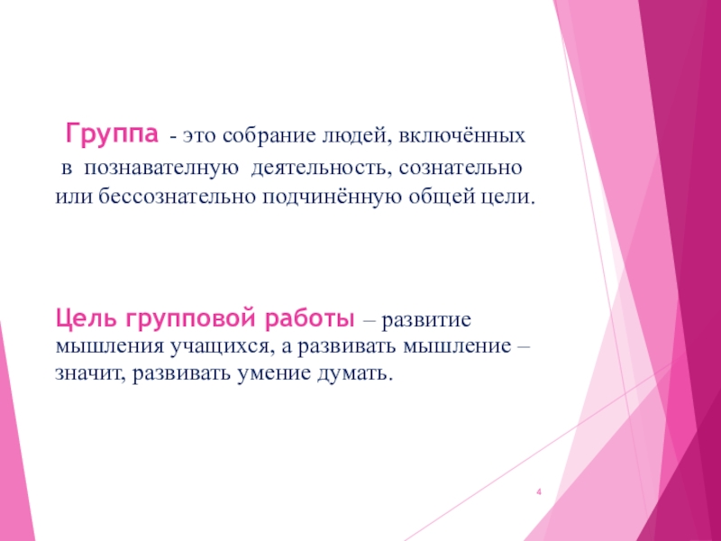 Цель групповой работы – развитие мышления учащихся, а развивать мышление – значит, развивать умение думать.