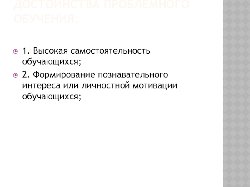 Достоинства проблемного обучения: 1. Высокая самостоятельность обучающихся;2. Формирование познавательного интереса или личностной мотивации обучающихся;