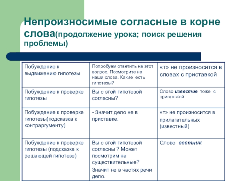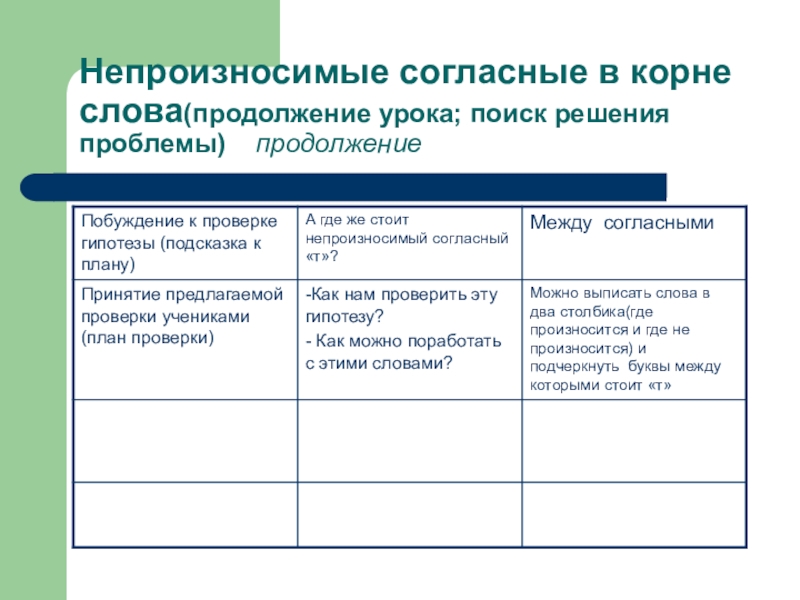 Слайд 12Непроизносимые согласные в корне слова(продолжение урока; поиск решения проблемы) продолжение