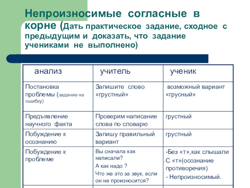 Слайд 11Непроизносимые согласные в корне (Дать практическое задание, сходное с предыдущим и