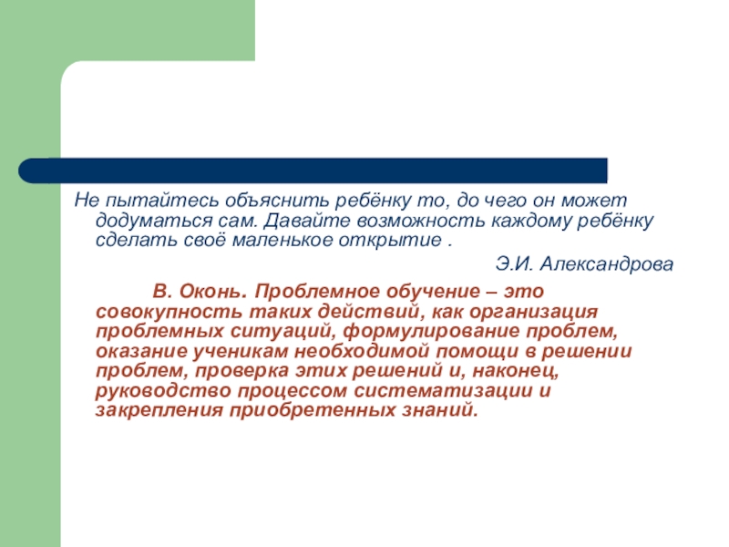 В. Оконь. Проблемное обучение – это совокупность таких действий, как организация проблемных ситуаций, формулирование проблем, оказание ученикам необходимой помощи в решении проблем, проверка этих решений и, наконец, руководство процессом систематизации и закрепления приобретенных знаний.