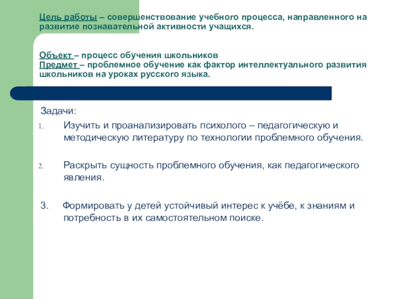 Предмет – проблемное обучение как фактор интеллектуального развития школьников на уроках русского языка.