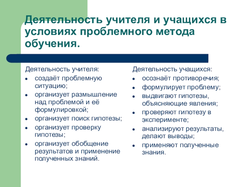 Слайд 8Деятельность учителя и учащихся в условиях проблемного метода обучения.