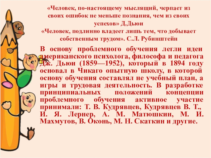 В основу проблемного обучения легли идеи американского психолога, философа и педагога Дж. Дьюи (1859—1952), который в 1894 году основал в Чикаго опытную школу, в которой основу обучения составлял не учебный план, а игры и трудовая деятельность. В разработке принципиальных положений концепции проблемного обучения активное участие принимали: Т. В. Кудрявцев, Кудрявцев В. Т., И. Я. Лернер, А. М. Матюшкин, М. И. Махмутов, В. Оконь, М. Н. Скаткин и другие.