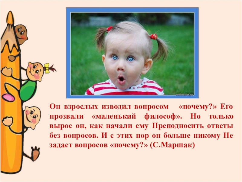 Слайд 19Он взрослых изводил вопросом «почему?» Его прозвали «маленький философ». Но