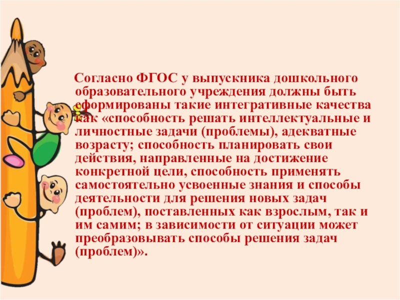 Слайд 2 Согласно ФГОС у выпускника дошкольного образовательного учреждения должны быть