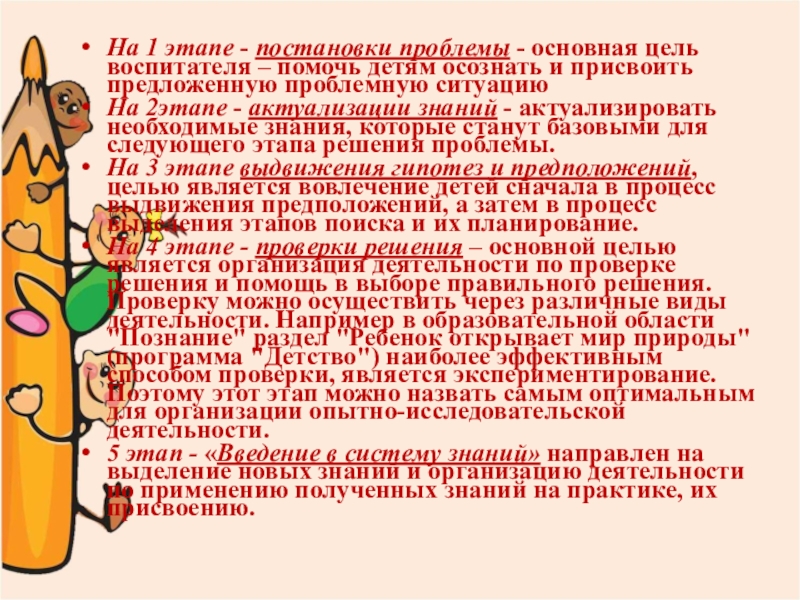Слайд 14На 1 этапе - постановки проблемы - основная цель воспитателя – помочь детям