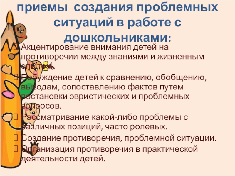 Слайд 10приемы создания проблемных ситуаций в работе с дошкольниками: