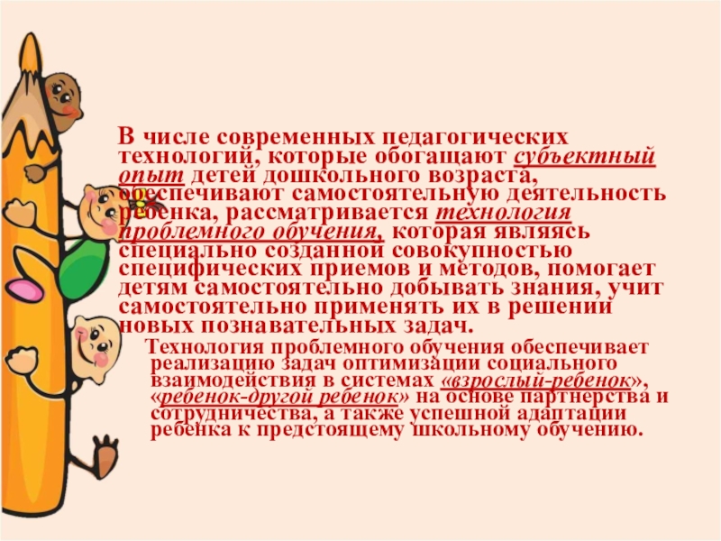 Технология проблемного обучения обеспечивает реализацию задач оптимизации социального взаимодействия в системах «взрослый-ребенок», «ребенок-другой ребенок» на основе партнерства и сотрудничества, а также успешной адаптации ребенка к предстоящему школьному обучению.