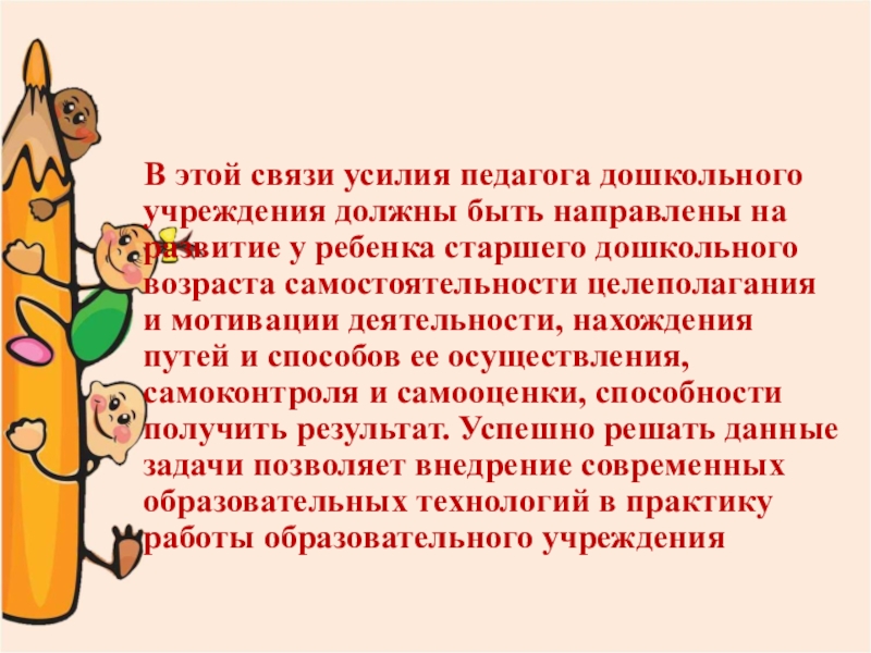 направлены на развитие у ребенка старшего дошкольного возраста самостоятельности целеполагания и мотивации деятельности, нахождения путей и способов ее осуществления, самоконтроля и самооценки, способности получить результат. Успешно решать данные задачи позволяет внедрение современных образовательных технологий в практику работы образовательного учреждения