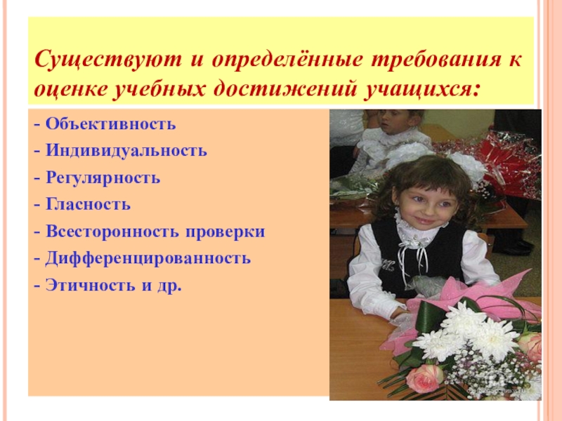 Слайд 65Существуют и определённые требования к оценке учебных достижений учащихся: