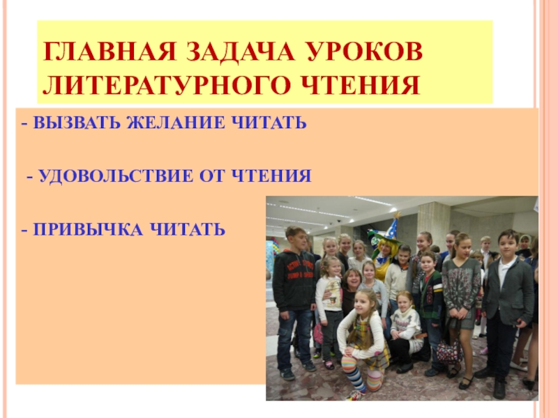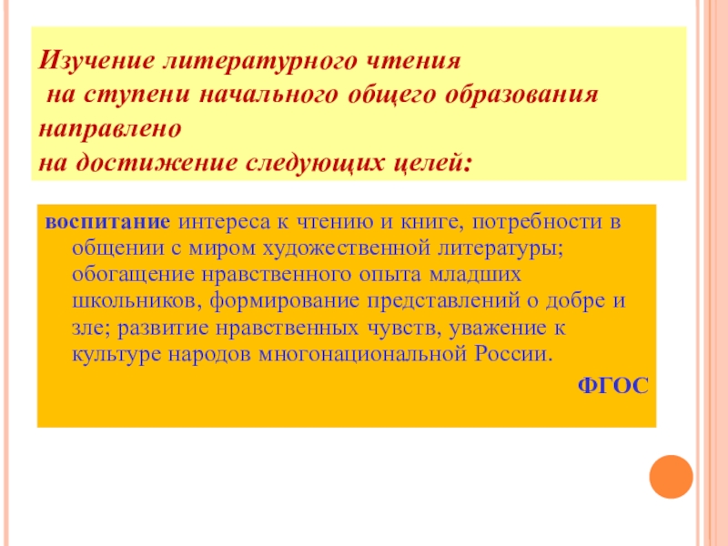 воспитание интереса к чтению и книге, потребности в общении с миром художественной литературы; обогащение нравственного опыта младших школьников, формирование представлений о добре и зле; развитие нравственных чувств, уважение к культуре народов многонациональной России.
