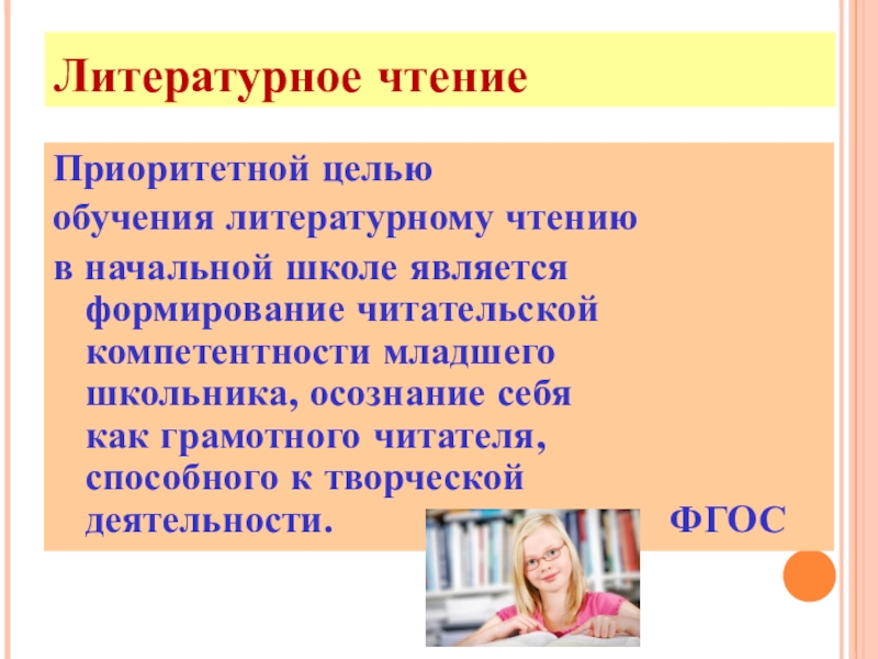 формирование читательской компетентности младшего школьника, осознание себя как грамотного читателя, способного к творческой деятельности. ФГОС