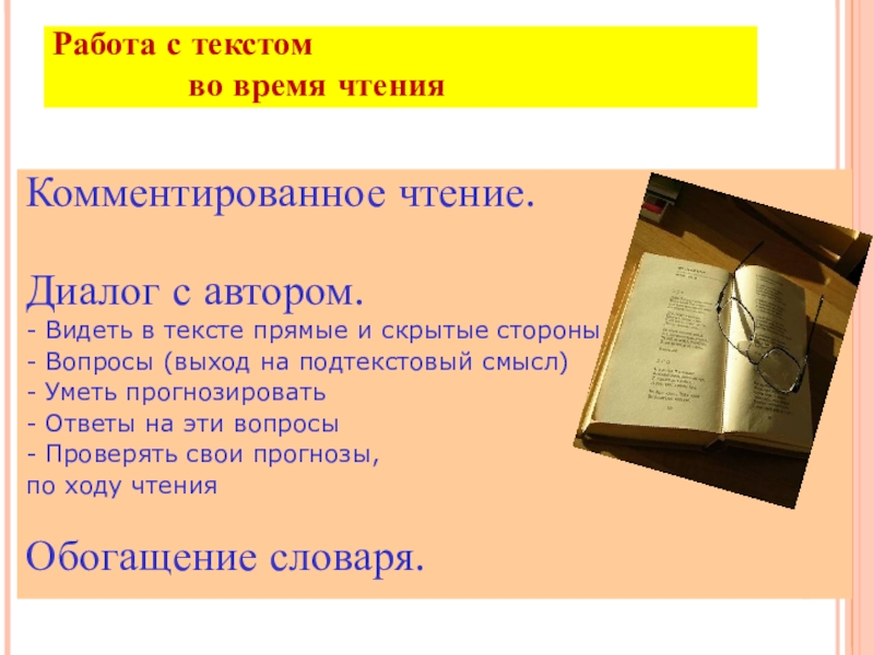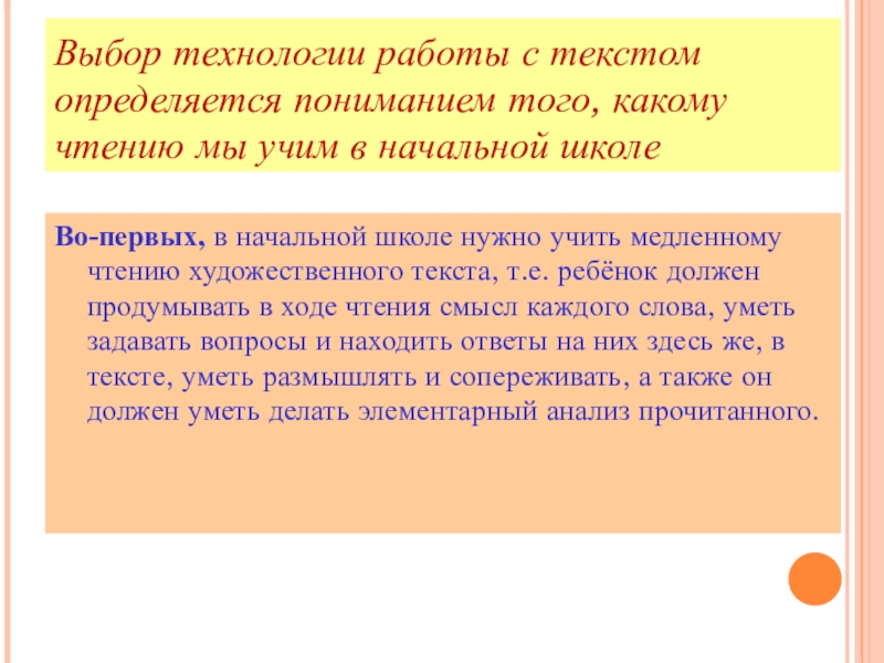 Слайд 24Выбор технологии работы с текстом определяется пониманием того, какому чтению мы