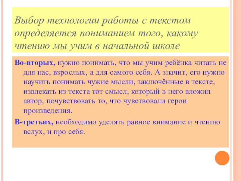 Слайд 23Выбор технологии работы с текстом определяется пониманием того, какому чтению мы