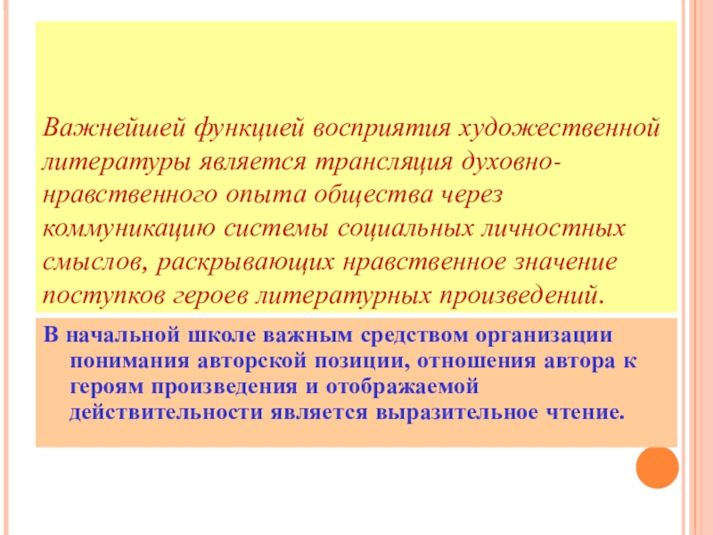 Слайд 12Важнейшей функцией восприятия художественной литературы является трансляция духовно-нравственного опыта общества через