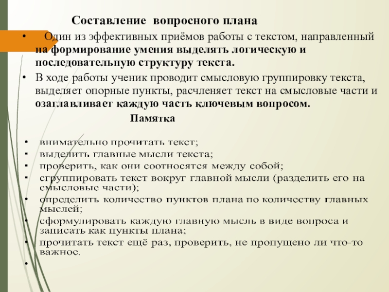 В ходе работы ученик проводит смысловую группировку текста, выделяет опорные пункты, расчленяет текст на смысловые части и озаглавливает каждую часть ключевым вопросом.