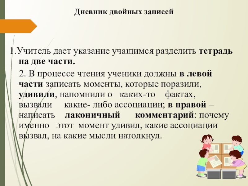 2. В процессе чтения ученики должны в левой части записать моменты, которые поразили, удивили, напомнили о каких-то фактах, вызвали какие- либо ассоциации; в правой – написать лаконичный комментарий: почему именно этот момент удивил, какие ассоциации вызвал, на какие мысли натолкнул.