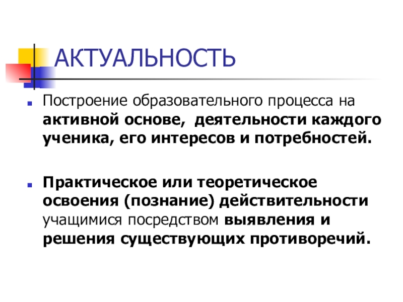 АКТУАЛЬНОСТЬПостроение образовательного процесса на активной основе, деятельности каждого ученика, его интересов и потребностей. Практическое или теоретическое освоения