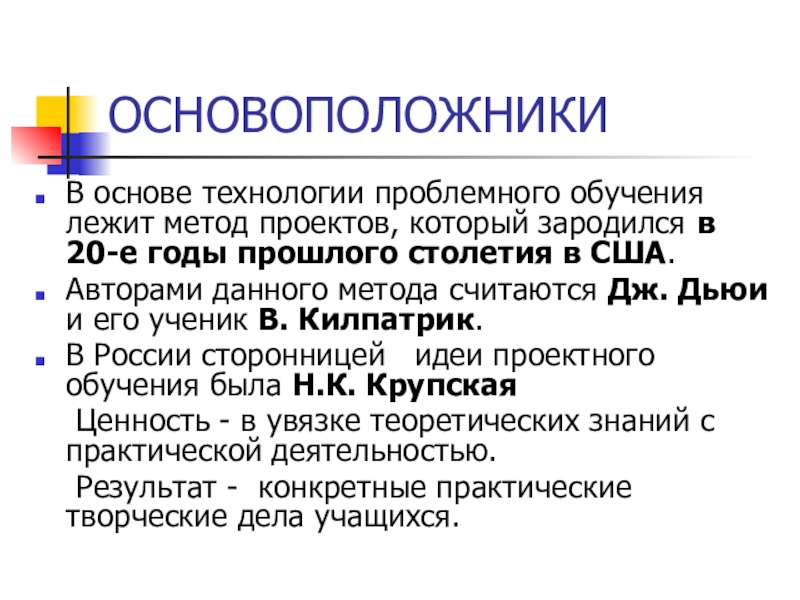 ОСНОВОПОЛОЖНИКИВ основе технологии проблемного обучения лежит метод проектов, который зародился в 20-е годы прошлого столетия в США. Авторами данного метода считаются Дж. Дьюи и его ученик В. Килпатрик. В России сторонницей   идеи проектного обучения была Н.К. Крупская Ценность