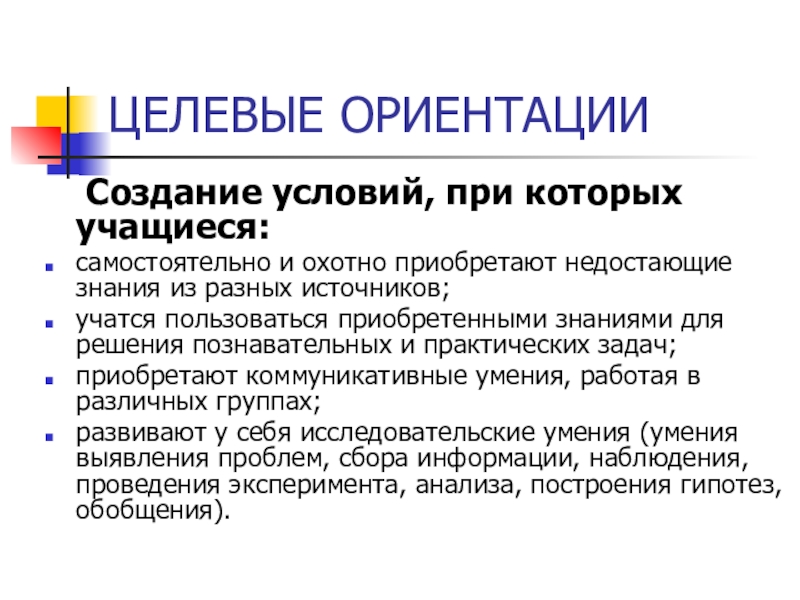 ЦЕЛЕВЫЕ ОРИЕНТАЦИИ	Создание условий, при которых учащиеся: самостоятельно и охотно приобретают недостающие знания из разных источников;учатся пользоваться приобретенными