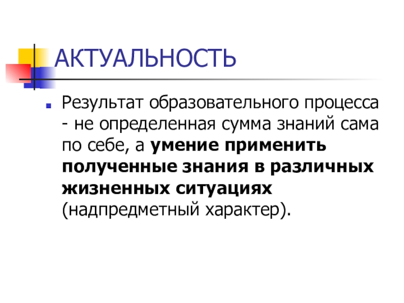 АКТУАЛЬНОСТЬРезультат образовательного процесса - не определенная сумма знаний сама по себе, а умение применить полученные знания в