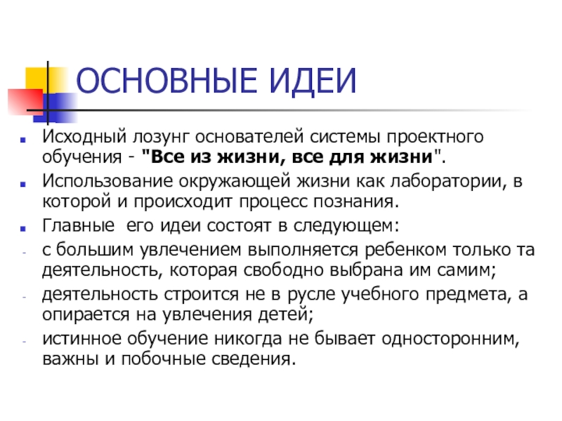 ОСНОВНЫЕ ИДЕИИсходный лозунг основателей системы проектного обучения -