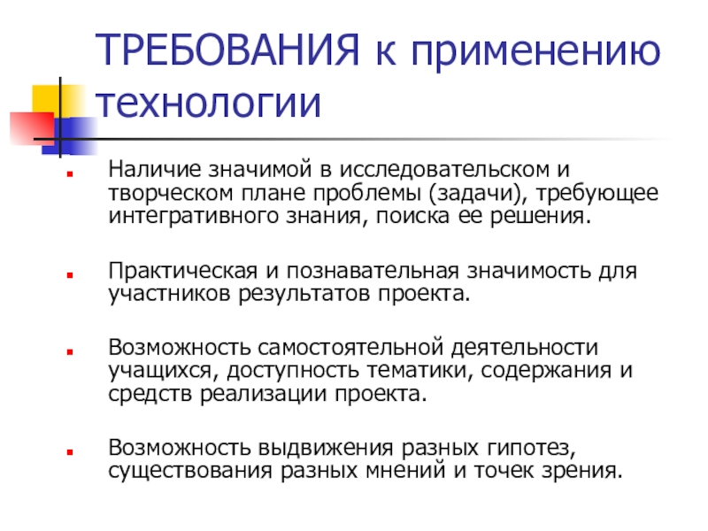 ТРЕБОВАНИЯ к применению  технологии Наличие значимой в исследовательском и творческом плане проблемы (задачи), требующее интегративного знания,