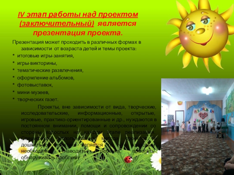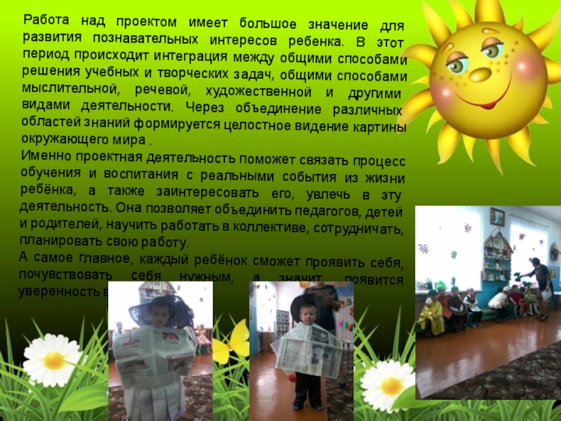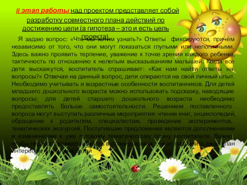 Я задаю вопрос: «Что мы хотим узнать?» Ответы фиксируются, причём независимо от того, что они могут показаться глупыми или нелогичными. Здесь важно проявить терпение, уважение к точке зрения каждого ребенка, тактичность по отношению к нелепым высказываниям малышей. Когда все дети выскажутся, воспитатель спрашивает: «Как нам найти ответы на вопросы?» Отвечая на данный вопрос, дети опираются на свой личный опыт. Необходимо учитывать и возрастные особенности воспитанников. Для детей младшего дошкольного возраста можно использовать подсказку, наводящие вопросы; для детей старшего дошкольного возраста необходимо предоставлять больше самостоятельности. Решением поставленного вопроса могут выступать различные мероприятия: чтение книг, энциклопедий, обращение к родителям, специалистам, проведение экспериментов, тематических экскурсий. Поступившие предложения являются дополнениями и изменениями к уже готовому тематическому плану воспитателя. Важно, чтобы педагог проявил гибкость в планировании, сумел подчинить свой план интересам и мнениям детей