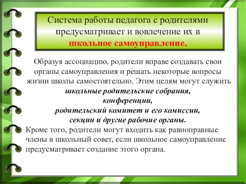 Образуя ассоциацию, родители вправе создавать свои органы самоуправления и решать некоторые вопросы жизни школы самостоятельно. Этим целям могут служить школьные родительские собрания,