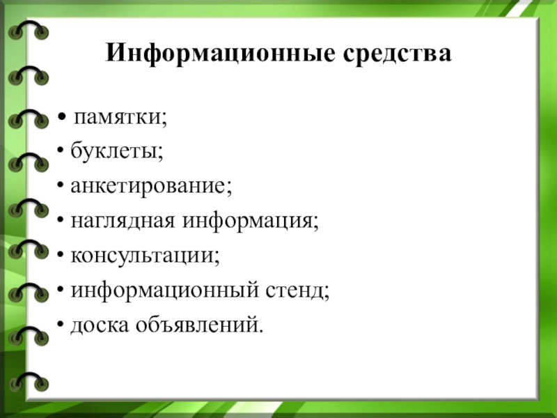 должна быть разнообразной, интересной и актуальной для родителей, например: