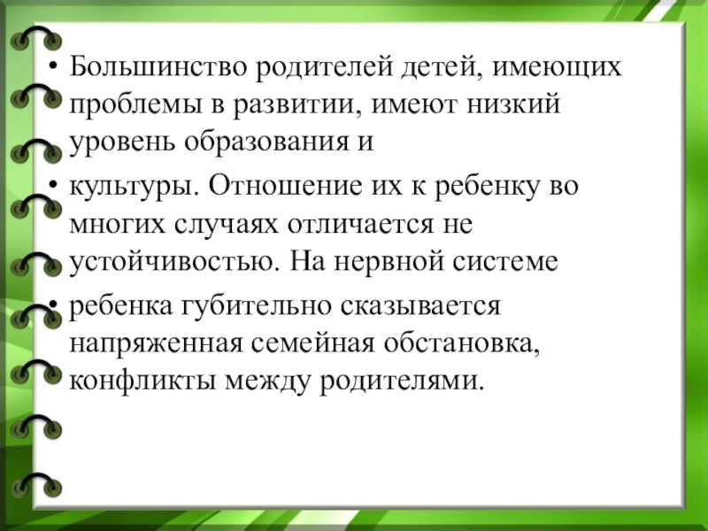 Слайд 3Большинство родителей детей, имеющих проблемы в развитии, имеют низкий уровень образования