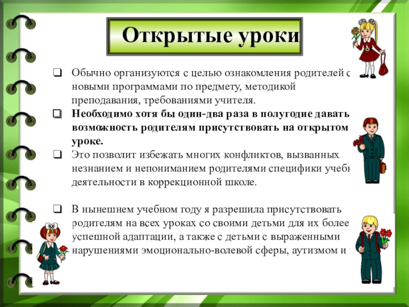 Необходимо хотя бы один-два раза в полугодие давать возможность родителям присутствовать на открытом уроке.