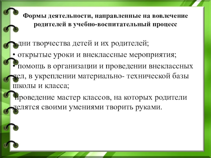 Слайд 12Формы деятельности, направленные на вовлечение родителей в учебно-воспитательный процесс