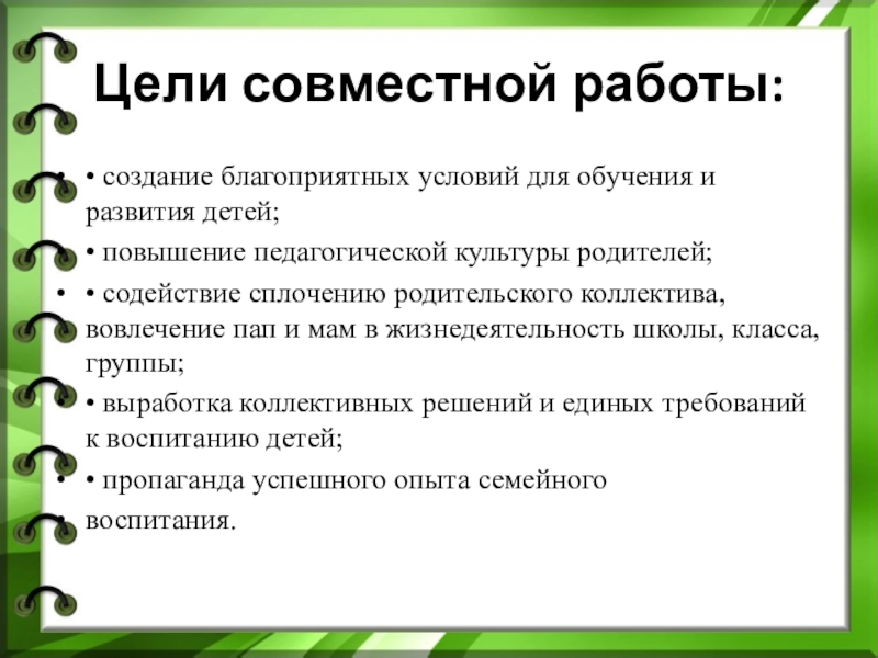 • выработка коллективных решений и единых требований к воспитанию детей;